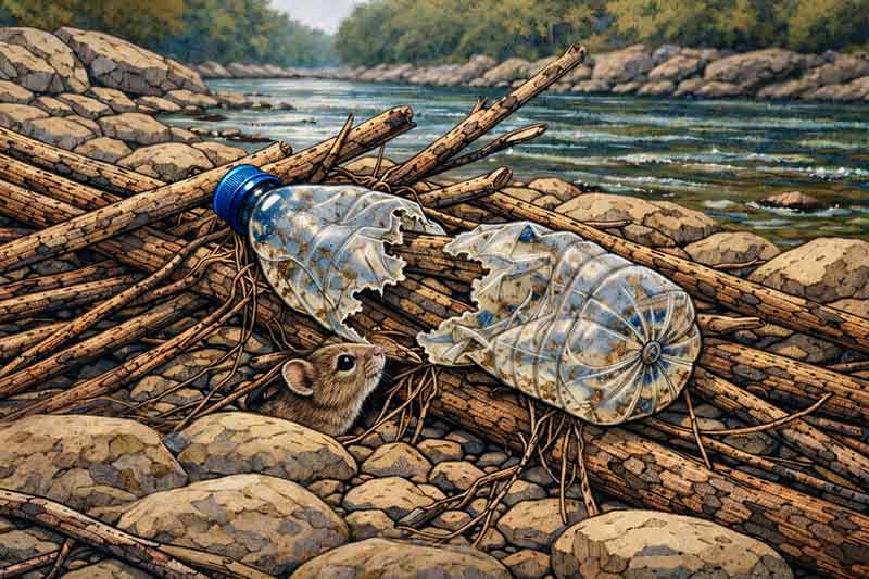 A rodent carries a piece of the bottle into its new shelter. The dense material insulates openings better than a leaf or a twig and lasts much longer. Rodents are not the only ones. Birds, amphibians, and insects do the same — any creature that manages to seize a piece of this “valuable material.”