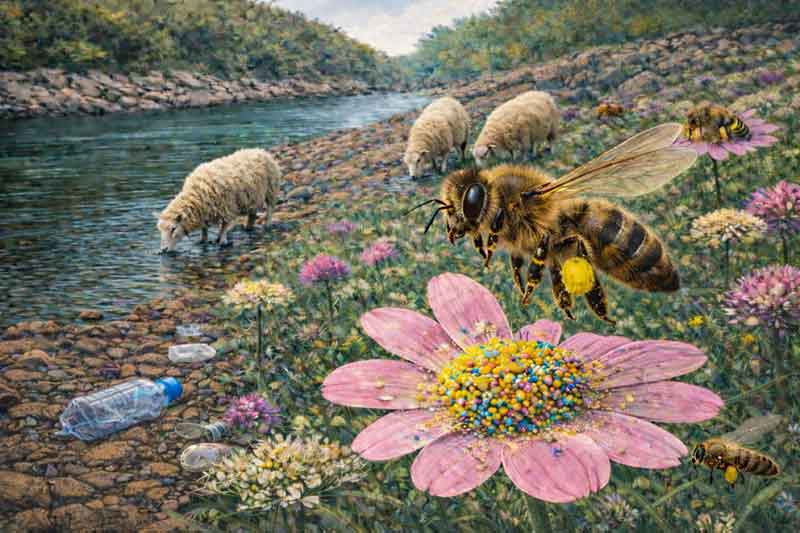 Bees carry microplastics from the flowers into their hives.